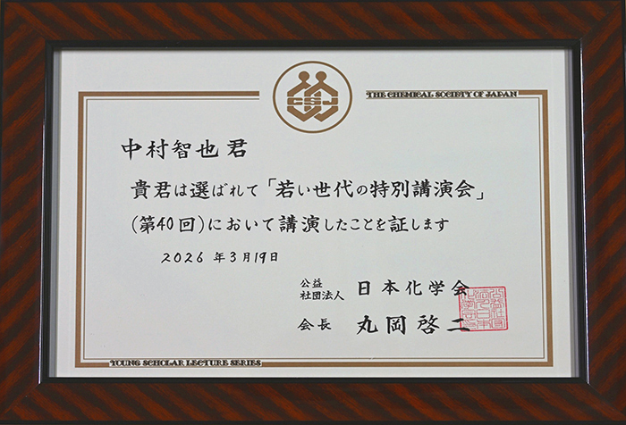 令和8年3月19日、中村智也 准教授が日本化学会第106春季年会(2026)「若い世代の特別講演証」を受賞しました。