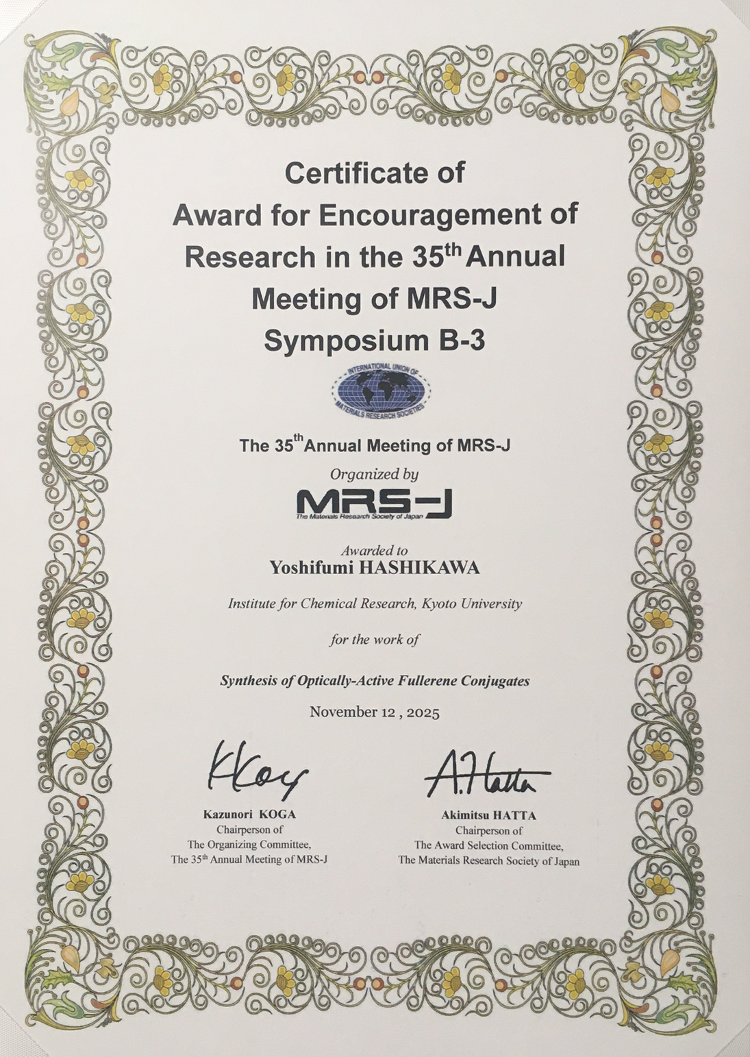 令和7年11月12日、橋川祥史 助教が第35回日本MRS年次大会 奨励賞を受賞しました。