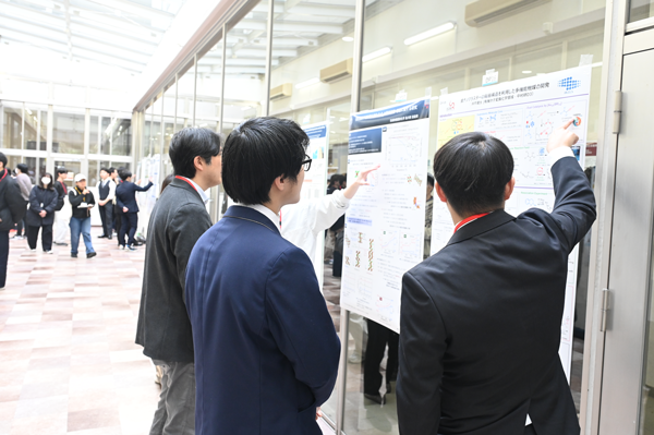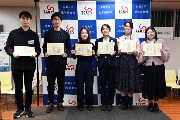 令和7年度 化学研究所 大学院生研究発表会を開催(2026.02.27) 公開日:2026年3月9日 令和8年2月27日(金)、令和7年度 化学研究所 大学院生研究発表会が共同研究棟大セミナー室およびライトコートにて開催されました。修士課程46名、博士課程20名のポスター発表のうち、修士・博士それぞれ3名が優秀者として選ばれ、授賞式にて島川祐一所長より表彰されました。 【ポスター発表 受賞者(博士課程)】 最優秀賞:中川 優奈 優秀賞:笠原 彰真 優秀賞:井上 宙夢 【ポスター発表 受賞者(修士課程)】 最優秀賞:吉川 あゆみ 優秀賞:高野 遥 優秀賞:吉田 笙子 受賞者 会場の様子