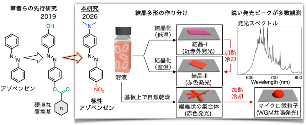 アゾベンゼンは、代表的な光応答性有機化合物として広く知られていますが、光照射による構造変化(光異性化)にエネルギーが消費されるため、通常はほとんど発光しません。山内らはこれまでに、剛直な置換基を有するアゾベンゼン誘導体が結晶化によって発光する「結晶化誘起発光(Crystallization-induced emission, CIE)」を見出していましたが、発光効率の低さが課題でした。本研究では、永久双極子モーメントを有する極性アゾベンゼンに着目したところ、結晶化温度を調節することで2つの結晶多形を完全に制御できることを見出し、詳細なスペクトル解析によりそれぞれの発光メカニズムを解明しました。また、従来の低極性アゾベンゼンの結晶と比較して、本研究の極性アゾベンゼンの結晶では、発光効率が大きく向上することも明らかにしました。さらに、ナノスケールとマイクロスケールの中間領域(メゾ領域)で制御された微粒子がウィスパリングギャラリーモード(Whispering Gallery Mode, WGM)による鋭い共鳴発光を、赤色から近赤外領域で示すことを初めて解明しました。また、アゾベンゼン特有の性質を利用し、光によってこの発光を制御できることも確認しました。